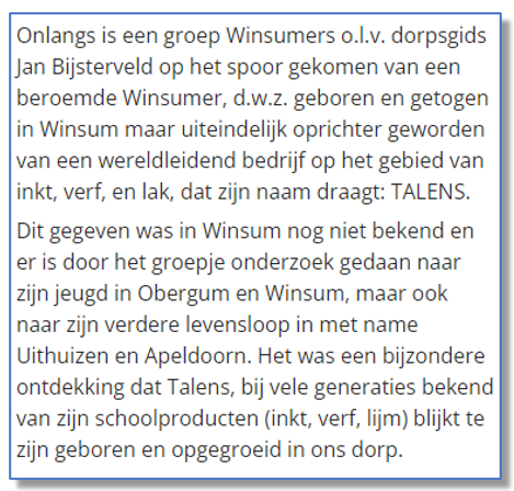 In 1899 start de Obergumer Marten Talens met een inktfabriek in Apeldoorn (Talens & Co; verf, lak en inkt). . Het is niet duidelijk waarom hij – als oud bankier- koos voor de inkt- en verfwereld. Hij had echter een groot zakelijk inzicht en wist de juiste contacten te leggen. Hij verzamelde de juiste mensen om zich heen, mensen met kennis van het product. Het achtervoegsel 'Co' was van chemicus F.Schmidt, een man die elders in Europa al een naam had opgebouwd. Hij was werkzaam bij een bedrijf dat zich bezig hield met het ontwikkelen en produceren van producten voor de inkt- en verfmarkt. De kwaliteit werd op een steeds hoger niveau gebracht. In eerste instantie werden alleen inkt en kantoorbenodigdheden gemaakt. Al snel ging Talens over op de productie van verven .
